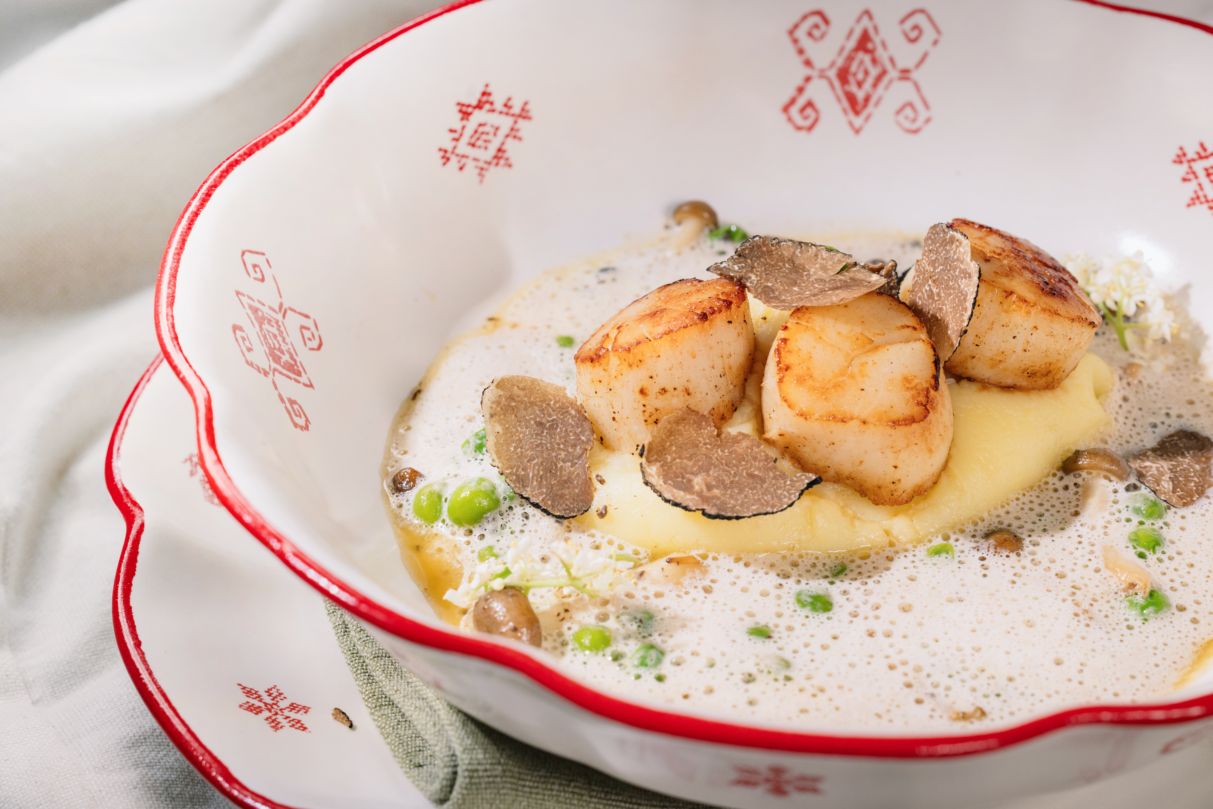 Grilled Scallops with Mashed Potatoes, Shimeji Mushrooms & Black Truffle