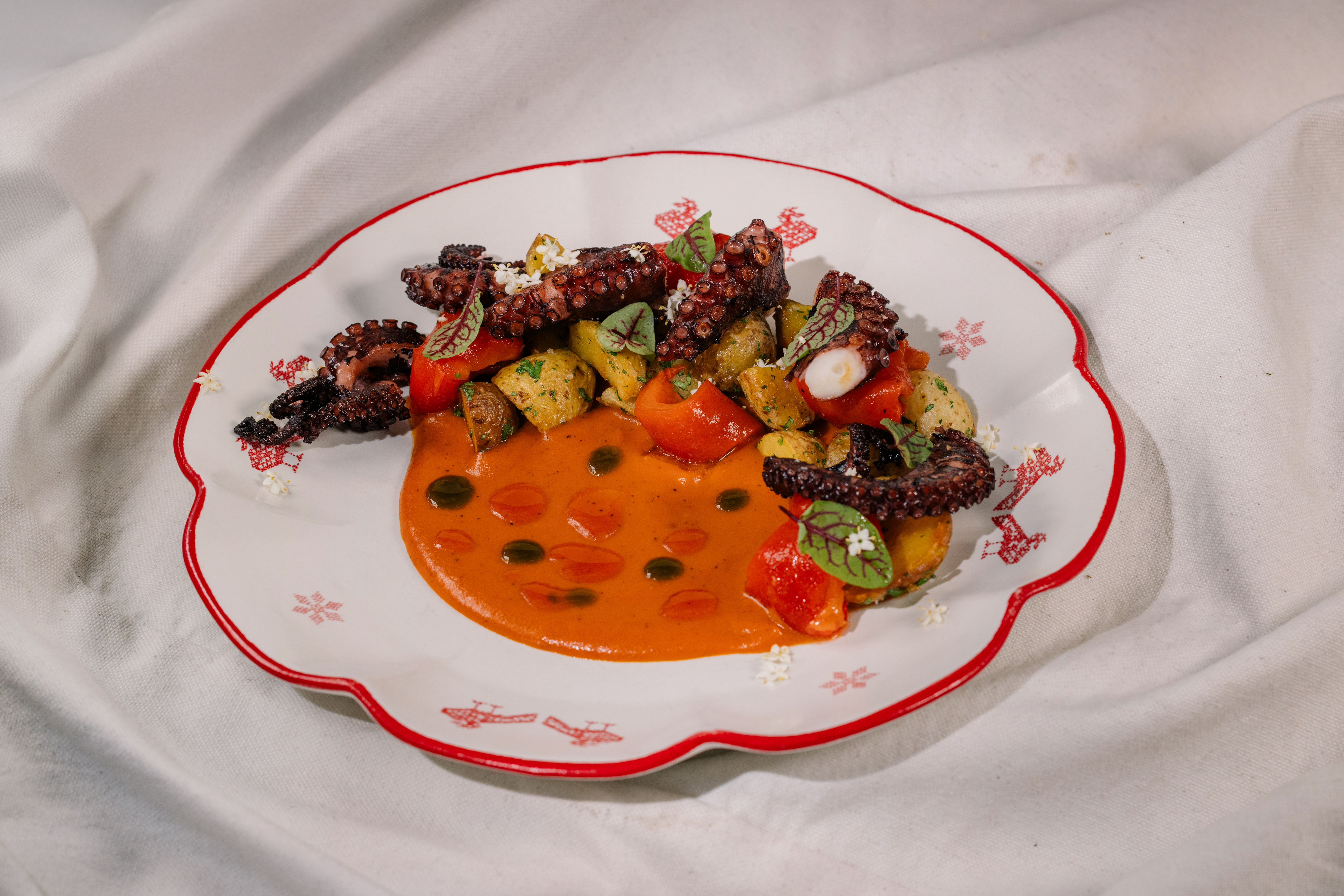 Octopus with Potatoes, Romesco Sauce & Ham Chips