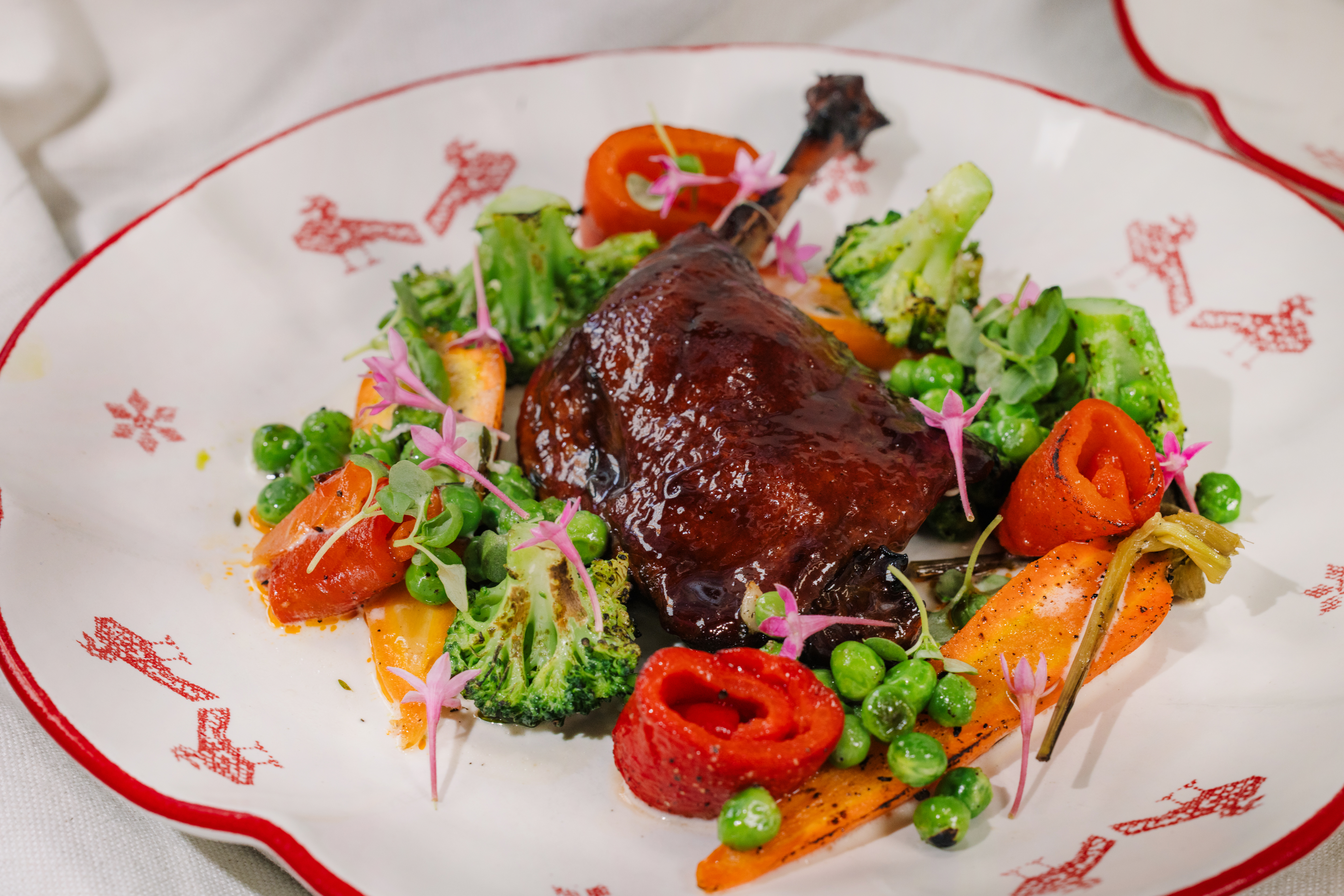 Duck with Roasted Vegetables, Goji Berries, and Port Wine Sauce